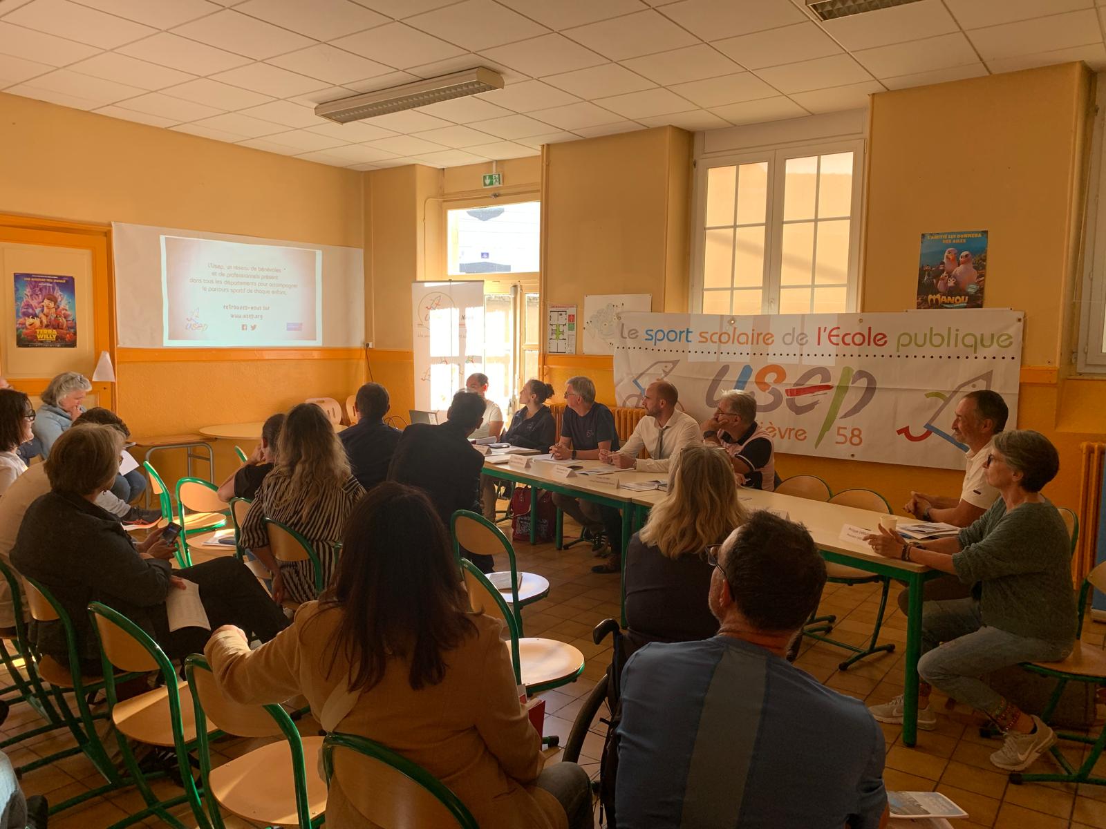 La journée s’est poursuivie à l’école du Mouesse avec la tenue de l’Assemblée Générale du comité départemental. De nombreux invités avaient répondu présents : Lionel Lécher vice-président du conseil départemental, les inspecteurs de l’éducation nationale Alexandre Michon et Michaël Billebault, Marie-France Jollet déléguée générale de la FOL 58, Yannick Chartier et Guillaume Largeron de la ville de Nevers, Philippe Charleux président du CRUSEP BFC, Rachel Alves Laborde pour l’UFOLEP58, Oscar Dos Reis représentant de la MAE58, Françoise Lurier pour l’OCCE 58, les représentants syndicaux Catherine Lopes Pires (FSU) et Florent Moulinet (SE-UNSA), Nathalie Laurent présidente du comité handisport et Jean-Claude Ferreira de la fédération française des motards courtois.